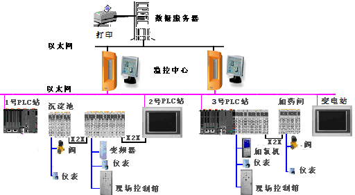 污水处理的工艺流程大体分为:格栅处理、泵房提升、沉砂处理、一次沉淀池、曝气池处理、二次沉淀池处理、泥浆制备、昭气利用。需要控制的区域主要有进水泵房,鼓风机房,脱水机房,变电所,加药间等区域。有栅格、总泵房、沉砂池、生物反应池、沉淀池、加氯间、污泥处理装置、变电站等控制对象。
